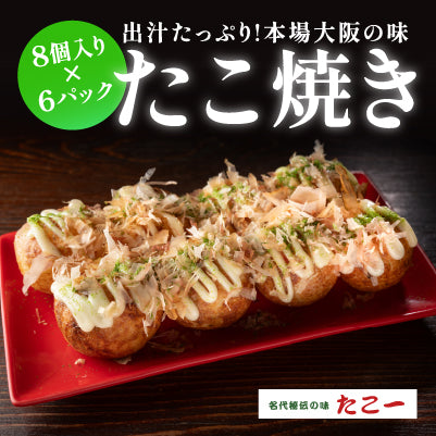 最新の冷凍技術でお店で食べるたこ焼きに負けないたこ焼きができました。もちろん、お店で一つ一つ丁寧に手焼きしております。試作を重ねた結果美味しく冷凍するために、たこ焼きは店舗に比べ、小粒になっております。